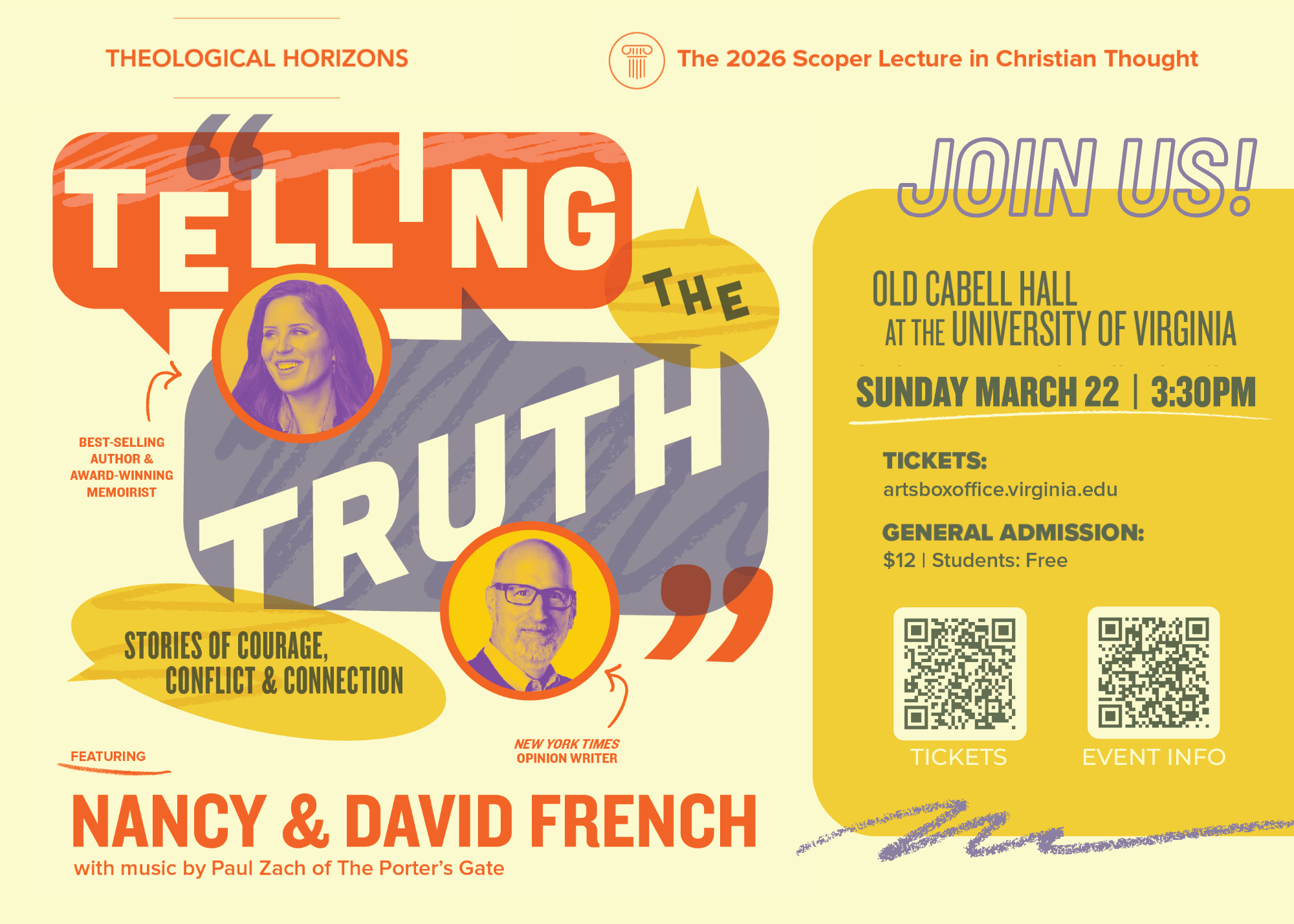 Theological Horizons proudly presents renowned New York Times opinion writer David French and best selling author Nancy French as the 2026 Scoper Lecturers in Christian Thought, featuring music by Paul Zach of Porter’s Gate. In UVA’s Old Cabell Hall at 3:30pm on Sunday, March 22